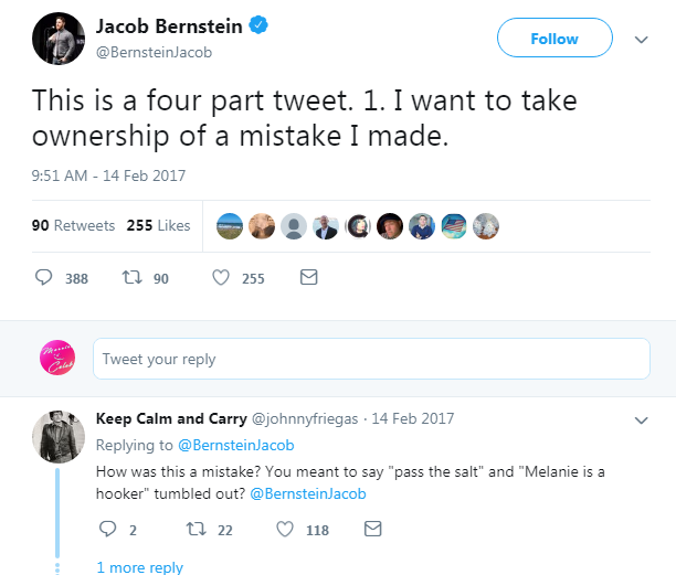 Bernstein continuously apologized on Twitter and called it a “stupid remark” made in a “personal conversation.” He has tweeted four times in a row asking forgiveness for his groundless tweet.